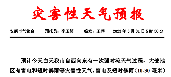 5月31日5時50分,安康市氣象臺發(fā)布《災(zāi)害性天氣預(yù)報》。