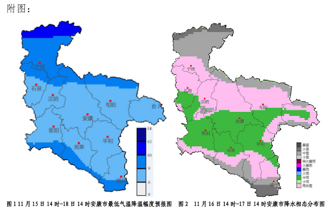 受冷空氣影響,15—17日全市過程日最低氣溫下降8~10℃,最低氣溫將出現(xiàn)在18日和19日清晨,全市大部會出現(xiàn)今冬初霜凍。預(yù)計最低氣溫:川道地區(qū)-4~2℃,中高山地區(qū)-8~-4℃,秦巴高山局地低于-8℃。16日夜間至17日白天我市大部有明顯吹風(fēng)天氣,陣風(fēng)可達5—6級。