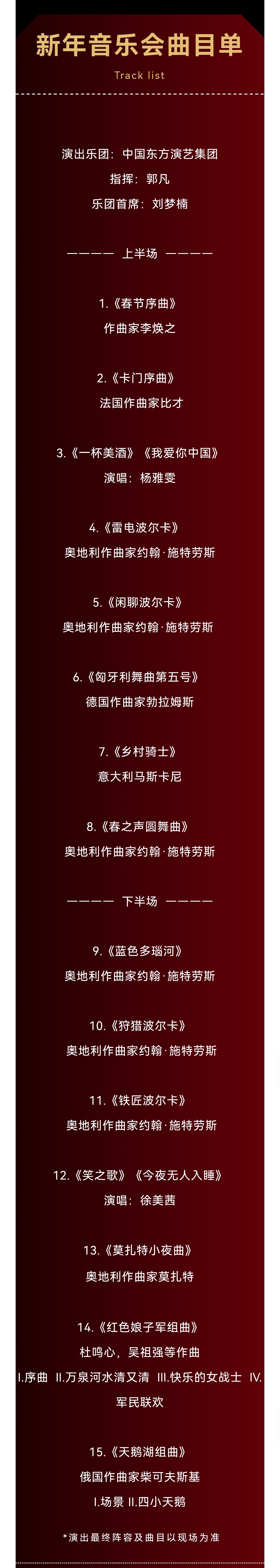 本場音樂會以“喜迎新年”為篇章,精粹二十首左右的中外“新年代表”經(jīng)典樂曲,獨(dú)具中國東方韻味的名曲和維也納新年音樂會的傳統(tǒng)樂曲,曲目中西合璧,加入極富創(chuàng)意的樂曲編排,歡快宏大、激情洋溢的音樂風(fēng)格,讓跨年氛圍與交響融合得渾然一體,在歡樂喜悅的音樂旋律中表達(dá)對新年新氣象的期盼與向往。