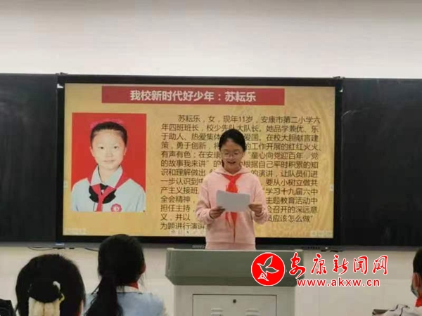學(xué)校利用國(guó)旗下講話向全體隊(duì)員發(fā)出向“新時(shí)代好少年”學(xué)習(xí)的倡議,該校安康市新時(shí)代好少年榮譽(yù)稱(chēng)號(hào)獲得者——蘇耘樂(lè)講述了她在日常學(xué)習(xí)和生活上的感受及獲得榮譽(yù)稱(chēng)號(hào)的經(jīng)歷和所付出的努力,號(hào)召全體隊(duì)員們積極行動(dòng)起來(lái),從一點(diǎn)一滴做起,從一言一行做起,從小樹(shù)立遠(yuǎn)大的理想,掌握豐富的知識(shí),培養(yǎng)良好的心理素質(zhì),以積極進(jìn)取迎接未來(lái)的挑戰(zhàn)。
