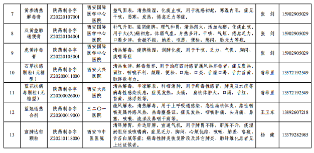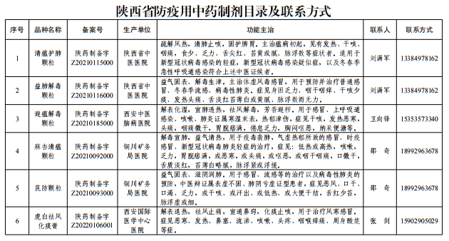 一是全市具有相關調(diào)劑品種使用需求且符合資質(zhì)的醫(yī)療機構均可從《陜西省防疫用中藥制劑目錄及聯(lián)系方式》(詳見附件)中的醫(yī)療機構購進目錄中的13種制劑產(chǎn)品,調(diào)劑使用時間從發(fā)文之日起至 2023年6月30日。