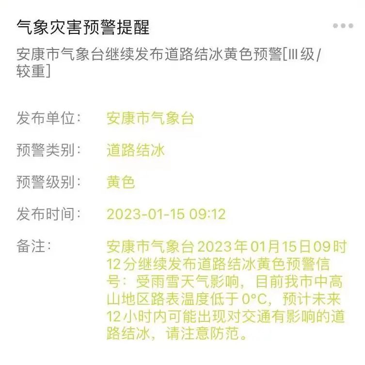 今天09時(shí)12分,安康市氣象臺(tái)繼續(xù)發(fā)布道路結(jié)冰黃色預(yù)警信號(hào):受雨雪天氣影響,目前安康市中高山地區(qū)路表溫度低于0℃,預(yù)計(jì)未來(lái)12小時(shí)內(nèi)可能出現(xiàn)對(duì)交通有影響的道路結(jié)冰,請(qǐng)注意防范。