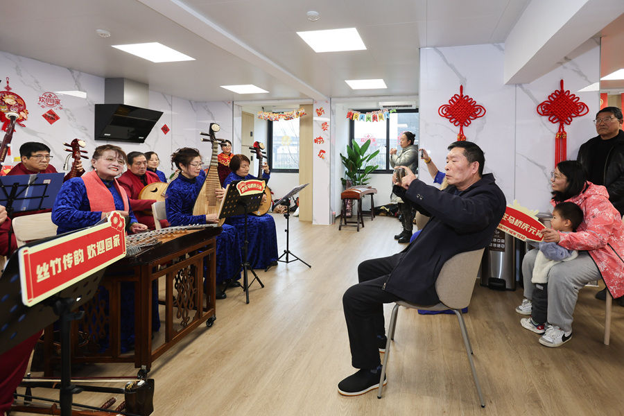 民樂隊(duì)在上海市閔行區(qū)新時(shí)代城市建設(shè)者管理者之家演奏(2024年2月23日攝)。新華社記者王翔 攝