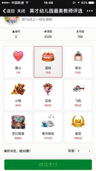 “除了投票外,還能送禮物,而禮物有一點(diǎn)愛心、10點(diǎn)蛋糕、500點(diǎn)飛機(jī)和1888點(diǎn)皇冠等9個種類。”李先生說,這些禮物都是需要花錢購買的,1點(diǎn)就是1元,并且所抵的票數(shù)與點(diǎn)數(shù)多少成正比,一點(diǎn)愛心可抵3票,而1888點(diǎn)的皇冠則可抵8000票!拔抑唤o老師投了一票,沒有購買禮物!崩钕壬f,他覺得花錢買禮物給老師增加投票讓這個評選活動變了味。