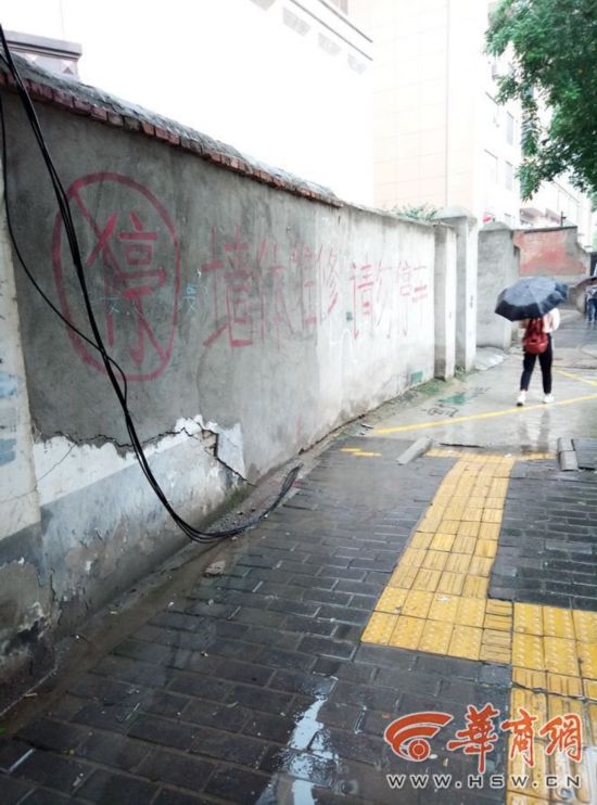 近日,市民張先生向華商報24小時新聞熱線029-88880000反映,稱南二環(huán)太乙嘉園小區(qū)外人行道上有一段長約10米的磚墻出現(xiàn)裂縫。張先生稱,小區(qū)業(yè)主已經(jīng)入住4年多,大約3年前該圍墻上就被寫了“危墻”二字,“圍墻里面有幾間門面房,但一直沒有使用,后來有人在門面房外蓋了一間活動板房,現(xiàn)被一家房產(chǎn)中介租賃!