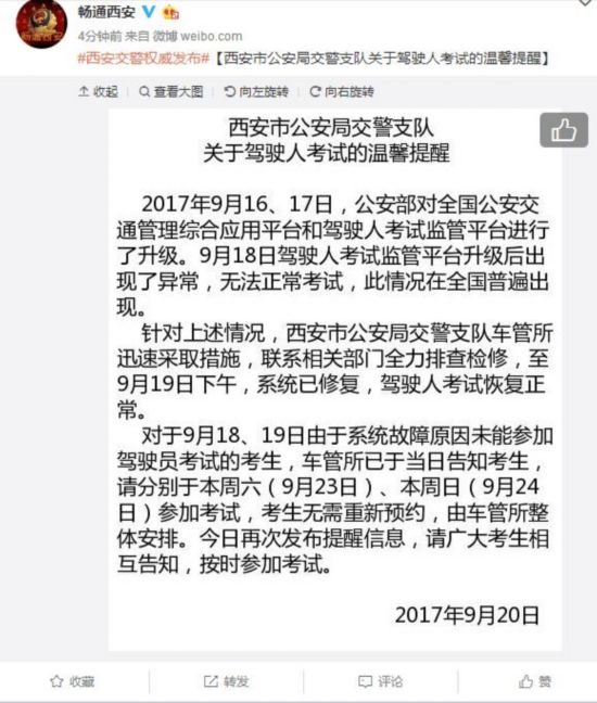 西安市交警支隊表示,因2017年9月16、17日,公安部對全國公安交通管理綜合應(yīng)用平臺和駕駛?cè)丝荚嚤O(jiān)管平臺進(jìn)行了升級。9月18日駕駛?cè)丝荚嚤O(jiān)管平臺出現(xiàn)了異常,無法正?荚嚕饲闆r在全國普遍出現(xiàn)。