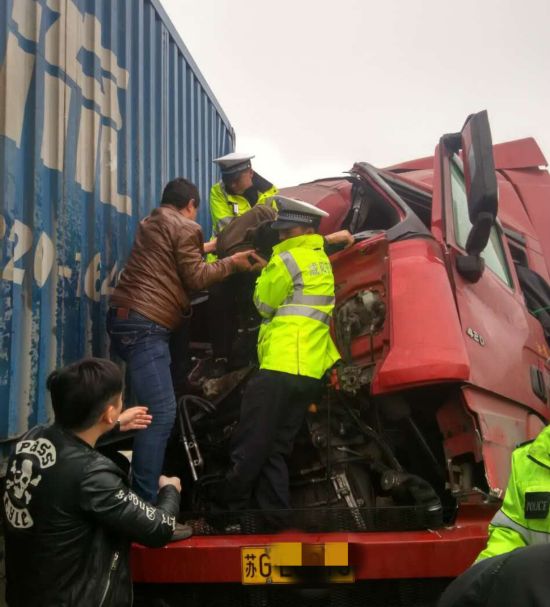 上午10時20分,在福銀高速長武至西安方向1860千米處,永長中隊副中隊長穆曉鵬和民警吳陳明、鄭強正在疏導分流車輛時,突然聽見對面道路上行方向傳來一聲巨響。隨后,他們立即趕赴現(xiàn)場發(fā)現(xiàn)在上行K1860 400米處貨車道有一輛蘇G牌照重型半掛車與一輛陜A牌照重型集裝箱貨車追尾,蘇G牌照車輛內(nèi)有人受傷被困。