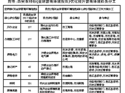 按照《西安市對標〈全球營商環(huán)境報告〉優(yōu)化提升營商環(huán)境任務分工》(見附件),各牽頭部門根據(jù)各自職責,從世界銀行《全球營商環(huán)境報告》中開辦企業(yè)、辦理施工許可、獲得電力、登記財產(chǎn)、獲得信貸、納稅、跨境貿(mào)易7個核心評價指標入手,圍繞減環(huán)節(jié)、優(yōu)流程、壓時限、提效率,牽頭制訂具體工作方案,于2017年10月31日前報市行革辦研究審定后組織實施。市統(tǒng)計局會同市行政學院盡快研究制訂我市縣域營商環(huán)境監(jiān)測評價指標,強化綜合衡量和定期排名,努力提升全市縣域營商環(huán)境和市場競爭力。