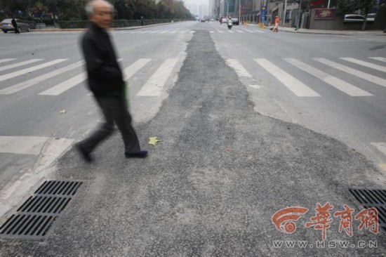 29日上午,華商報記者趕到建工路,王先生所說的西行車道馬路路面中間車道顯然是新修過的,但表面卻似乎蓋著一層碎渣類的東西,圍著深色路面擺放著幾個活動隔離墩,一名環(huán)衛(wèi)工裝束的老漢正在新科路路口路段清掃路面的碎渣,旁邊一輛小推車上已經(jīng)裝了大半車碎石子。