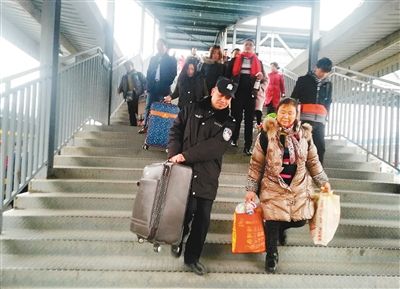 民警幫助旅客拎包,將其送至站臺(tái)。記者張松 通訊員楊長空 郝黎俊 攝