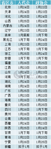 | 注:資料來源于各省日報,人大、政協(xié)網(wǎng)站或當(dāng)?shù)匦麄鞑块T,內(nèi)容截至1月5日,實際時間以當(dāng)?shù)貢h召開時間為準。 |