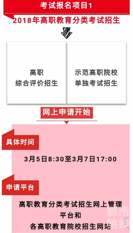 今年,參加分類考試招生的示范高職院校,由15所增加到18所。申請示范高職院校的考生,在提出入學申請后,于3月17號參加統(tǒng)一命題的筆試考試,科目為語數(shù)外三科,總分為300分,成績在18所院校間通用;面試由各院校自行組織,考查考生的職業(yè)適應性,是否符合報考專業(yè)要求,總分為200分。
