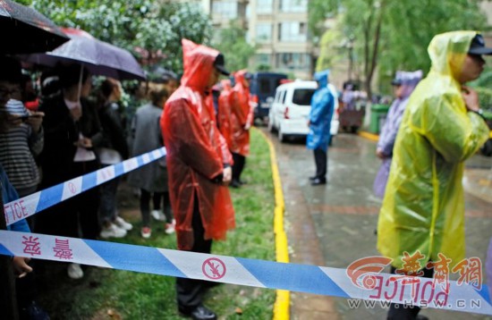 昨日,得知指認(rèn)現(xiàn)場(chǎng)的消息后,近百名業(yè)主冒著大雨前往事發(fā)單元樓下圍觀。當(dāng)嫌疑人令某杰被從警車上押解下來(lái)時(shí),業(yè)主們?cè)僖部刂撇蛔∽约旱那榫w,大聲呼喊著,“畜生!嚴(yán)懲兇手!”