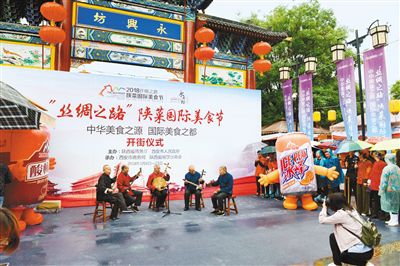 “關(guān)中巷的鄉(xiāng)黨們,陜南街的伙計(jì)們,陜北里的后生婆姨們,擼起袖子加油干,今兒個(gè),咱開(kāi)市大吉”。昨日上午,記者在永興坊陜西非遺美食文化街區(qū)看到,盡顯老陜豪邁風(fēng)格的“開(kāi)街儀式”吸引了不少游人駐足。永興坊園區(qū)東邊方言字廣場(chǎng)特設(shè)為“2018‘絲綢之路’陜菜國(guó)際美食節(jié)”主題宣傳區(qū),匯聚了陜西107區(qū)縣的百余種非遺美食和土特產(chǎn)品。
