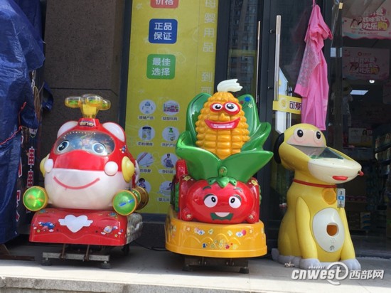 在雁塔區(qū)萬象春天北門,藥店、母嬰店、小超市門口均擺放了幾臺(tái)搖搖車。