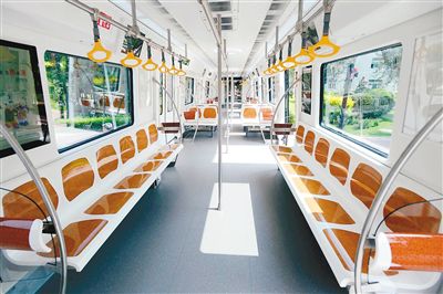 機場線車輛美觀大方,飽滿圓潤的大流線型車體給人以速度感和沖擊力,簡單的“松石藍”腰線貫穿整個純白車身,內(nèi)部車輛座椅暖色的蜂窩狀花紋使車輛更具層次感。