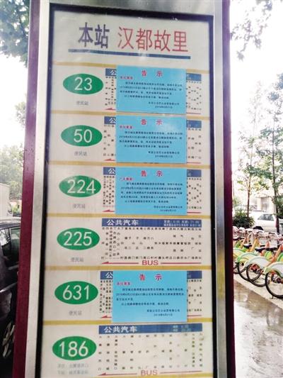 王女士說,她家住在漢城北路漢都故里小區(qū),門前有6條公交線,她在土門上班,每天乘坐23路和631路就可直達單位附近,十分方便?墒,8月20日下班回到小區(qū)門口的公交車站時,發(fā)現(xiàn)有224路、50路、23路、631路公交站牌上貼著一張告示稱: 8月23日起,這4條公交線路取消漢都故里便民站!皾h城北路沿線除了漢都故里小區(qū)外,還有雅卓花園、簡約花園和風(fēng)尚馨筑等多個居民小區(qū),涉及的居民比較多,一下子取消了4條公交線,將會給多少人的出行帶來不便?”王女士說,8月23日早上,她在小區(qū)門口公交車站準備乘坐公交車去上班時,發(fā)現(xiàn)只剩下225路和186路,另外4趟公交車均不見蹤影。她朝南步行了10分鐘左右來到城西客運站時,發(fā)現(xiàn)這4條線路的起點站原來被挪移到了此處。