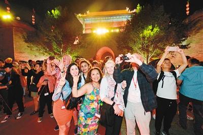 作為“英國千人游陜西”的重要活動之一,先期來到陜西旅游的500余名英國游客在“大唐鴻臚寺卿”的引領(lǐng)下,在精彩的仿唐迎賓儀式——《賓至盛唐》演出中,海外游客在主題曲《天下長安》的雄渾氣概里,穿過永寧門吊橋、賞月城、觀絕美舞姿,一起聆聽盛世繁華的豪情贊歌,體驗陜西文化、品味陜西美食、觸摸陜西歷史。