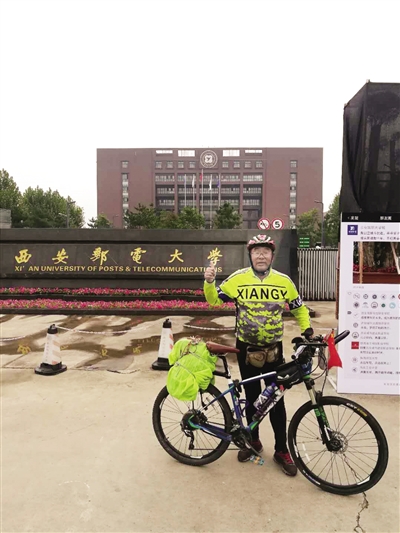 為了中秋節(jié)與家人團(tuán)聚,63歲的王長(zhǎng)寶從遼寧丹東騎自行車抵達(dá)西安。 記者 趙麗莉 攝