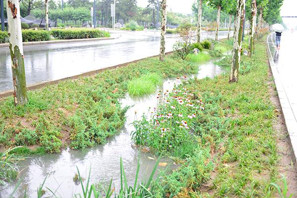 雨天時(shí),雨水從地勢(shì)高處流向鋪滿植被的下凹式綠化帶、雨水花園、雨水收集池、綠色屋頂、植草溝等,逐級(jí)被消納。多余的未被消納的雨水,則順著植草溝渠流向?yàn)栁餍鲁侵行膮^(qū)域的中央公園。