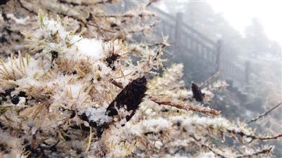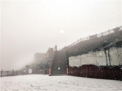 據(jù)太白山天下索道工作人員湯敏介紹,當日1時20分,在海拔3511米的天圓地方景點就開始有雨夾雪出現(xiàn)。到了13時左右降雪強度逐漸增大,整個太白山頂霎時銀裝素裹、分外妖嬈。而到當日15時,天圓地方景點地面上的積雪已達3–4厘米。
