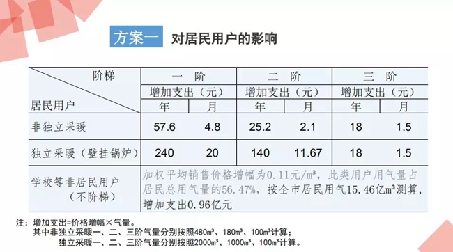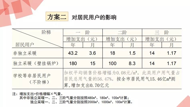 一是非獨(dú)立采暖用戶,按照調(diào)整后的居民用氣一階銷售價格,一階年最高氣量為480立方米計算,每戶年增加支出57.6元,月增加支出4.8元;二階最高氣量180立方米氣量計算,每戶年增加支出25.2元,月增加支出2.1元,對用氣量達(dá)到三階年最高氣量660立方米以上的用戶,氣價增幅0.18元每立方米,用氣100立方米,增加支出18元。