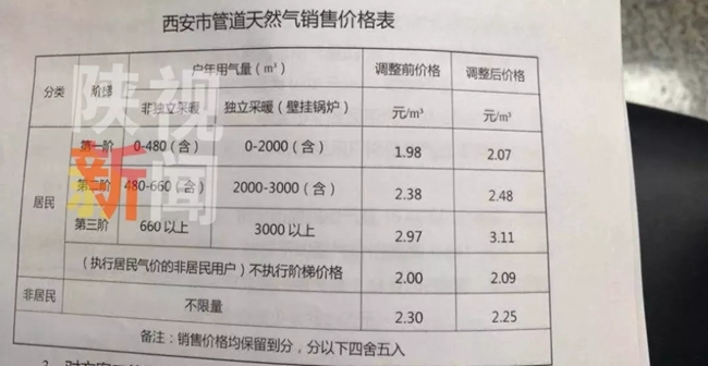 一是調(diào)整居民用氣銷售價格。綜合中省調(diào)價因素,西安市需要疏導(dǎo)上游門站價格增幅0.056元每立方米。