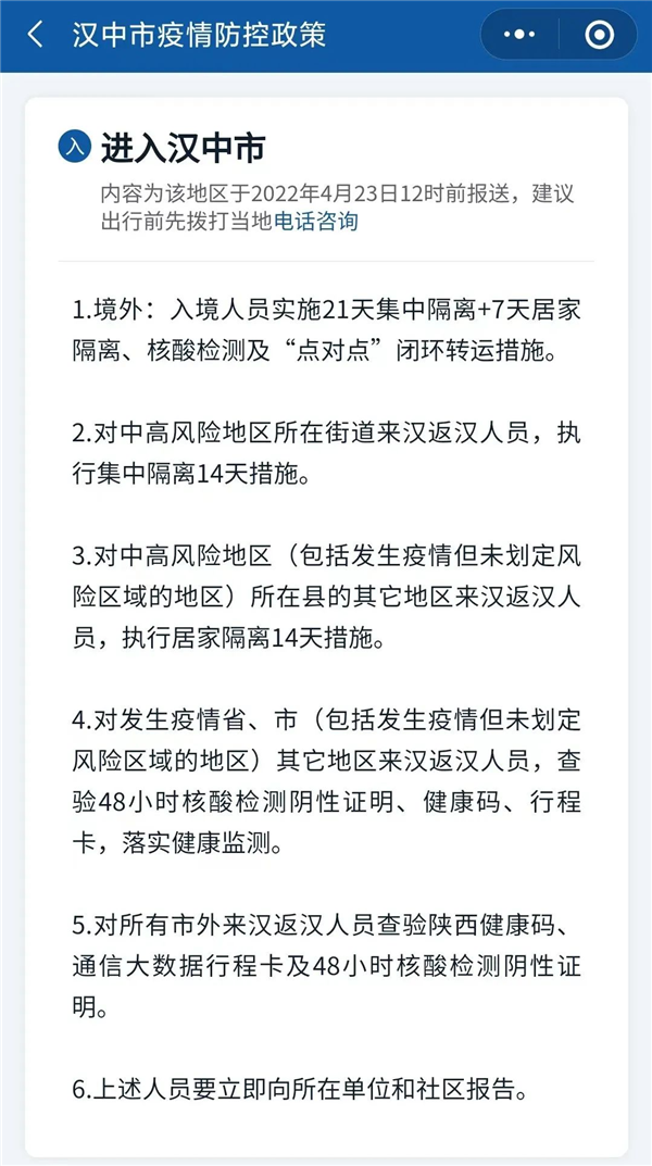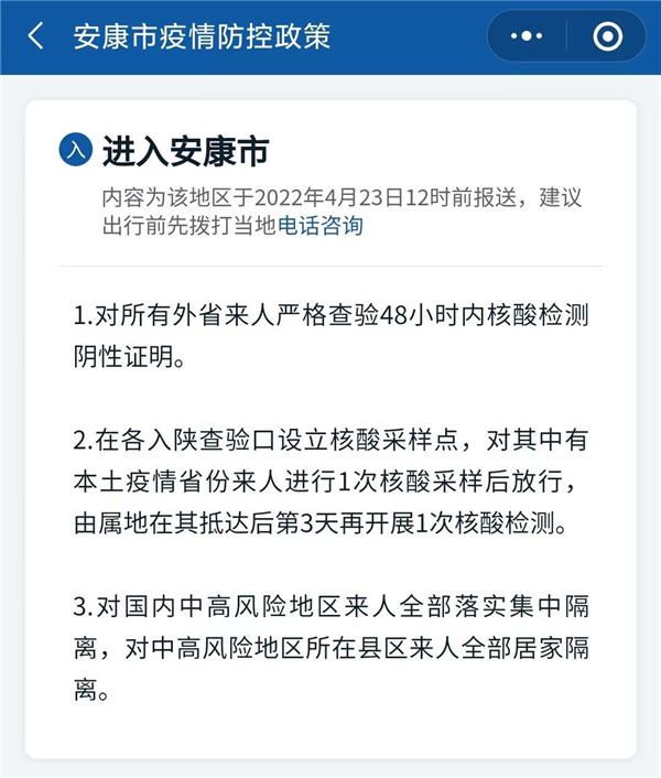 陜西省內(nèi)各市最新的疫情防控政策來了。ń刂4月23日)建議出行先撥打當(dāng)?shù)仉娫捵稍儯?/strong>M2Z安康新聞網(wǎng)