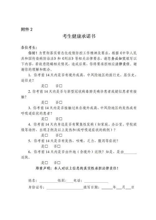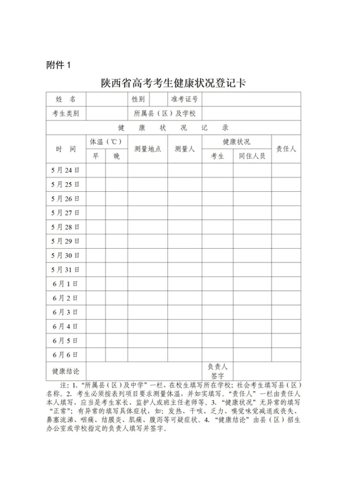 健康監(jiān)測。考生在高考前14天到高考結(jié)束應(yīng)進(jìn)入靜態(tài)管理,堅(jiān)持做到非必要不流動(dòng),不到人群流動(dòng)性較大的場所活動(dòng),不接觸有疫情風(fēng)險(xiǎn)的人員,做好每日體溫測量、記錄并進(jìn)行健康狀況監(jiān)測,填寫《陜西省高考考生健康狀況登記卡》(附件1)和《考生健康承諾書》(附件2)?忌】等绯霈F(xiàn)異常狀況應(yīng)立即向?qū)W校和高考報(bào)名地考試機(jī)構(gòu)報(bào)告,不得謊報(bào)、瞞報(bào)。