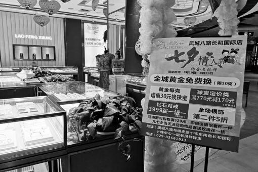 商場(chǎng)里一些商家打出﹃七夕﹄活動(dòng)廣告 有人將七夕稱為中國的情人節(jié)。一年一度的農(nóng)歷七夕將至,西安街頭也被濃濃的甜蜜氣氛包圍。與此同時(shí),節(jié)日所帶動(dòng)的“浪漫……