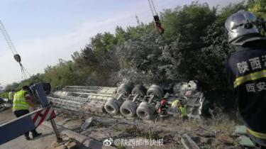 一輛裝載電石的貨車在西安繞城附近側翻 事故路段已通