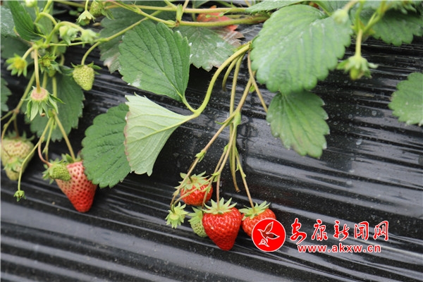 “媽媽,這里的草莓真得好甜。”一個剛進大棚里采摘的小朋友欣喜地喊著。