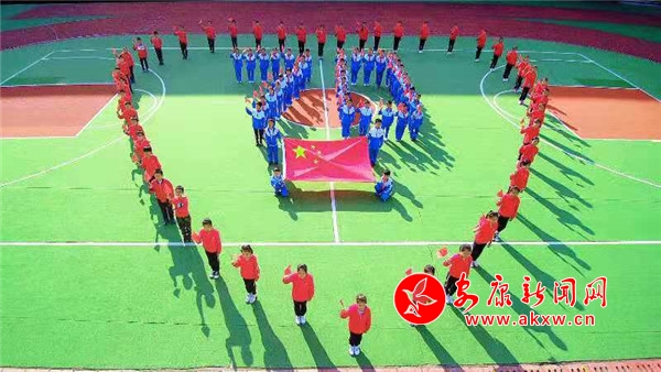 幾十名身穿藍(lán)色班服的學(xué)生在操場正中央排成數(shù)字“70",在數(shù)字正前面,四名同學(xué)展開國旗,然后,數(shù)十名身穿紅色班服的學(xué)生在外圍圍成"心"形。"70",象征著70周年,"心"型, 寓含著孩子們對(duì)偉大祖國的熱愛。整個(gè)造型寓意深刻,活動(dòng)表現(xiàn)形式新穎獨(dú)特,令人耳目一新。