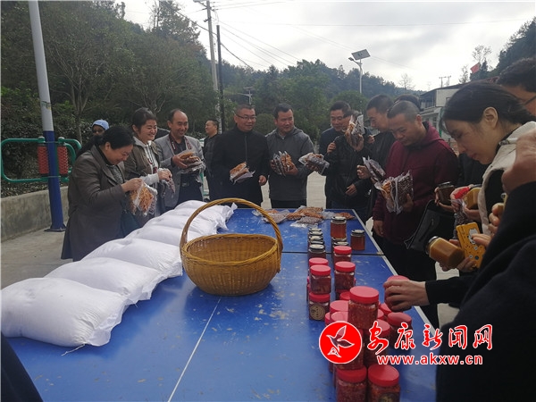 在黃金村駐村工作隊(duì)組織下,20戶貧困戶把自家生產(chǎn)加工的土特產(chǎn)品運(yùn)到村中心廣場,廣場上堆放著苦蕎、土蜂蜜、土雞蛋、包谷酒、干蘿卜片、豆腐乳、黃豆醬和新鮮丹參等產(chǎn)品,幫扶干部踴躍購買,現(xiàn)場產(chǎn)品銷售一空;顒(dòng)共銷售了20戶貧困戶11種農(nóng)副產(chǎn)品,銷售額達(dá)1.2萬余元。