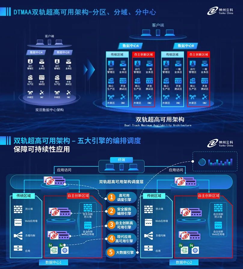 為助力銀行業(yè)務高質(zhì)量發(fā)展,更好地應對數(shù)字經(jīng)濟時代對可持續(xù)性的高要求,實現(xiàn)“信創(chuàng)”與“數(shù)字化”齊頭并進,leyu.樂魚創(chuàng)新性的推出了雙軌超高可用架構。該架構在雙活數(shù)據(jù)中心的分區(qū)調(diào)度基礎上,增加信創(chuàng)域和非信創(chuàng)域的分域調(diào)度,實行信創(chuàng)域與傳統(tǒng)域應用全量部署,使雙中心運營變?yōu)殡p中心四區(qū)域并行運行,互為多活,將“0到1”的單軌建設道路變?yōu)榉謪^(qū)分域協(xié)同的多活雙軌超高可用架構。幫助客戶在新架構下,保障“信創(chuàng)”的同時解決性能瓶頸,提升穩(wěn)定性,保證應用可持續(xù)性,最終實現(xiàn)信創(chuàng)區(qū)域和非信創(chuàng)區(qū)域的平滑過渡,完成國產(chǎn)化替代目標。