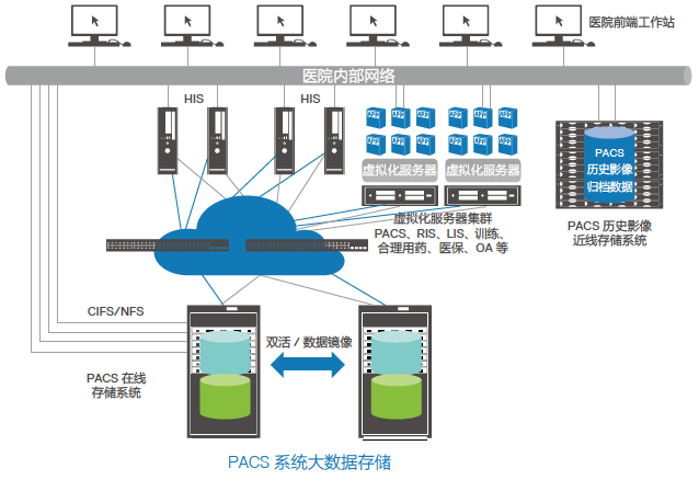 高速調用影像:采用 SAN+NAS 存儲作為核心存儲,存儲 PACS 系統數據庫和在線的 PACS影像文件,提供高速的數據訪問能力;