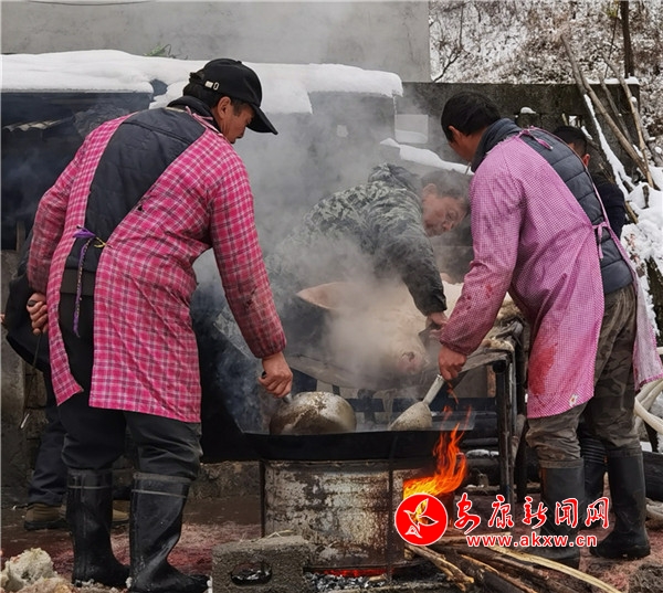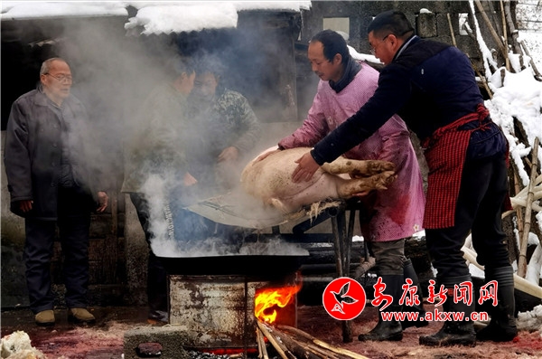 時(shí)逢陰歷十月初九,鎮(zhèn)坪縣迎來(lái)了入冬以來(lái)第一場(chǎng)降雪。漫天大雪,給原本氣溫偏低的化龍山腳下的張家坪增添了寒冷。然而,上竹鎮(zhèn)化龍村8組村民張成凱和叔叔張秀柱,卻帶著家人熱火朝天地忙著殺豬腌制臘肉,絲毫沒(méi)有寒冷的感覺(jué)。