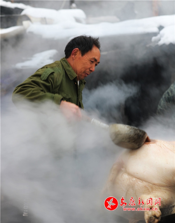 當(dāng)天,張成凱家一口氣殺了6頭豬,約1200斤,收入3萬(wàn)多元;張秀柱家殺了2頭豬,400余斤,收入約1萬(wàn)元。